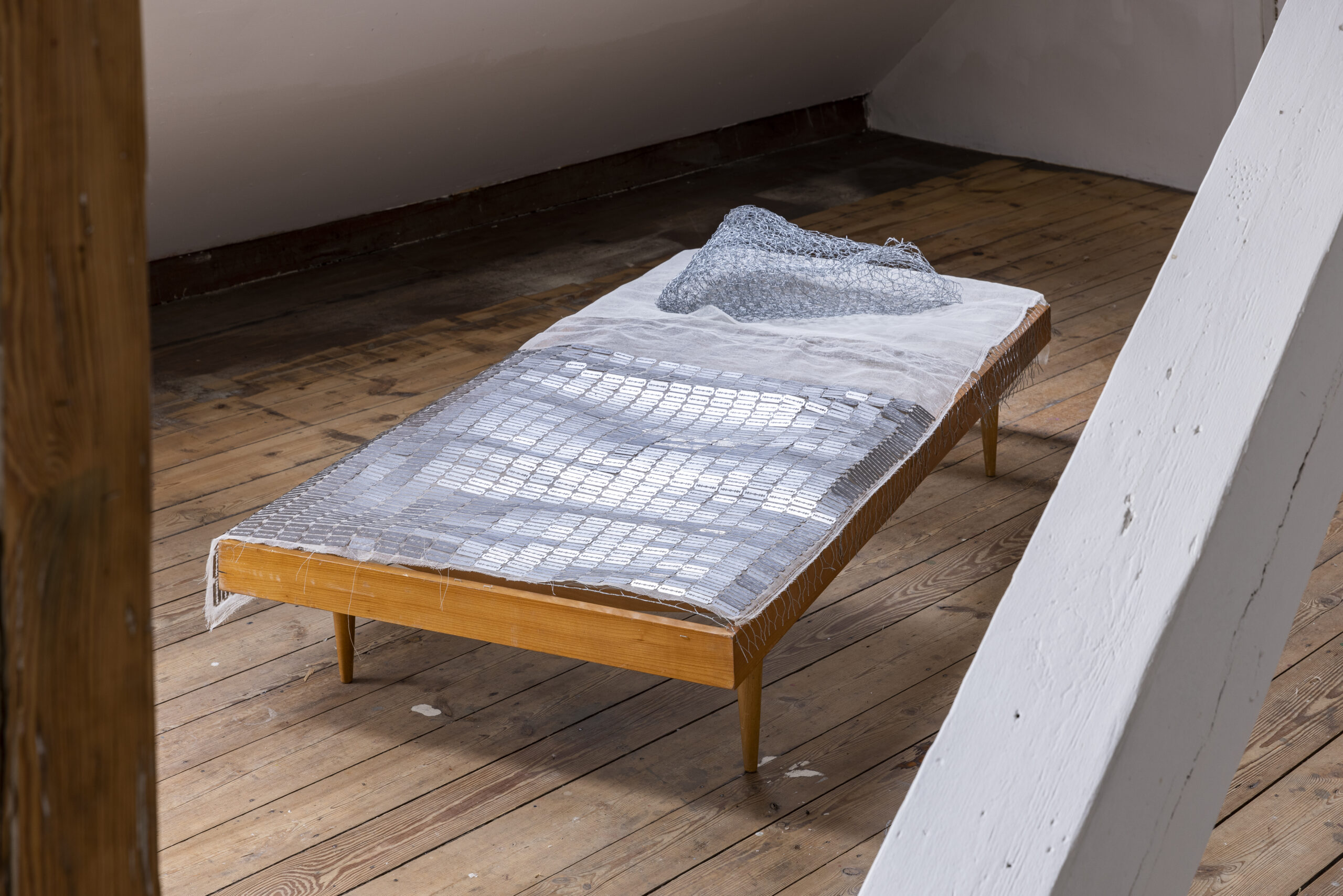Sarah Steger: Resting Place. Draht, Gaze, Holz, Rasierklingen. 200 × 90 × 70 cm. 2022. PHOTO: Christian Stein